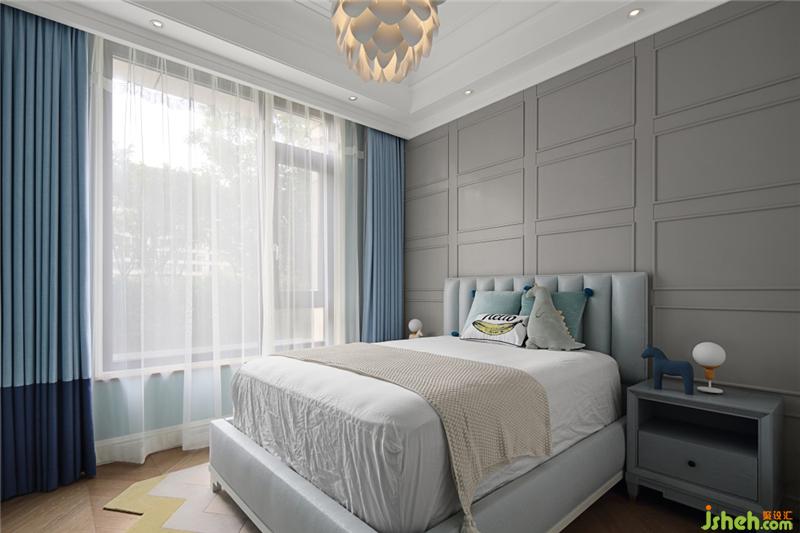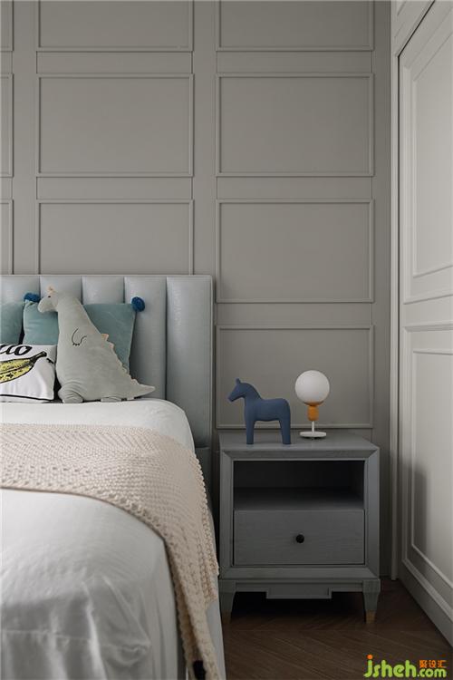 男寶寶的臥室以蒂芙尼藍(lán)色馬卡龍為主要色調(diào),中性灰色作為背景,松果燈給孩子空間增添樂(lè)趣;