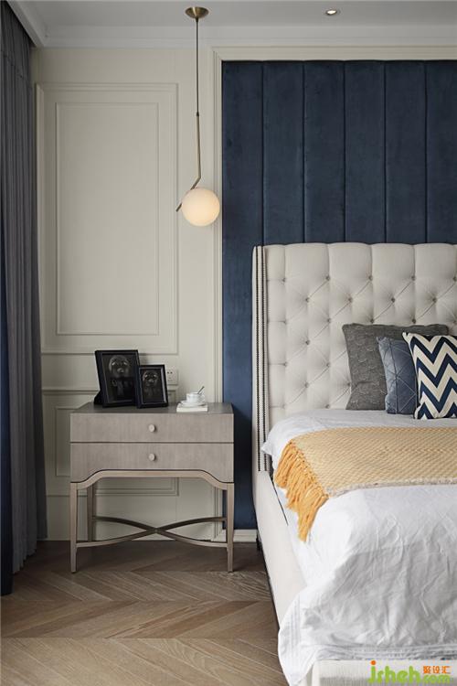 主臥以墨藍(lán)背景映襯淺色家具和墻板,幾何圖案的黃色細(xì)節(jié)點(diǎn)綴其間,床頭柜上方的球燈柔和過(guò)高的層高,金屬鏈條燈提升藝術(shù)性、增加亮點(diǎn);