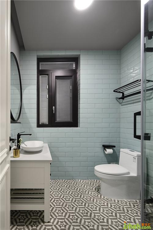 男寶寶的衛(wèi)生間延續(xù)蒂芙尼藍(lán)色主題,中性灰搭配黑白地面磚,黑色金屬配件的使用讓空間增加剛毅質(zhì)感;