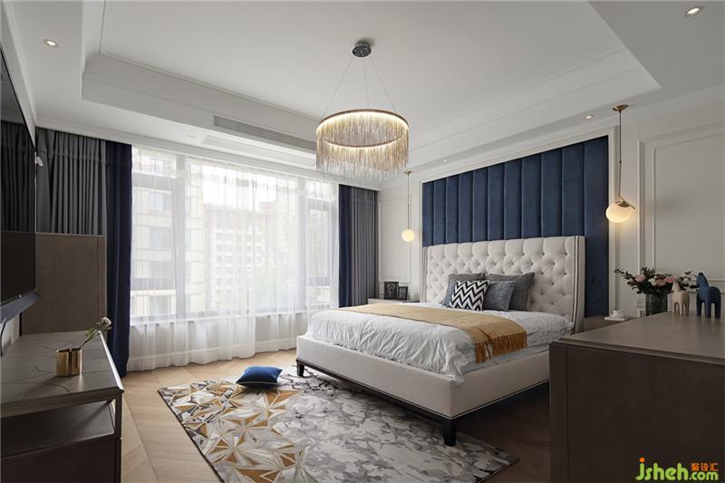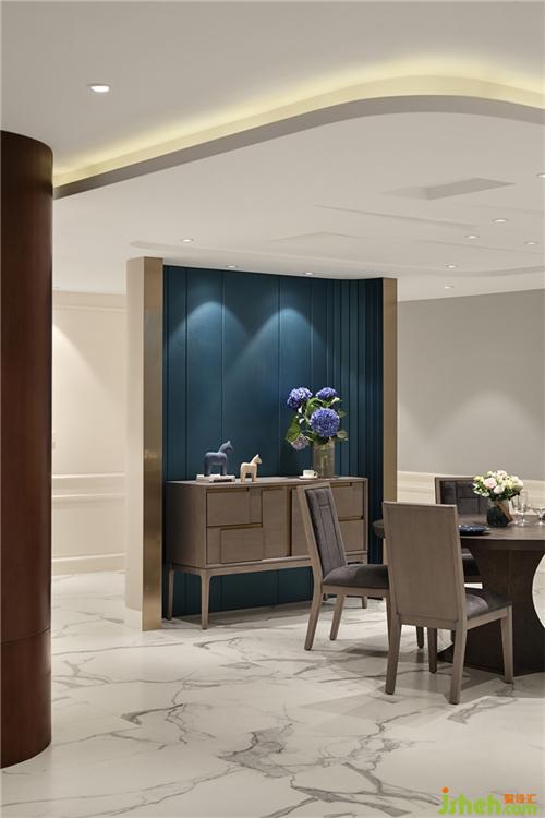 餐廳頂較低,下層的樓板給設(shè)計帶來難題,索性將低就低,適當(dāng)優(yōu)化,做成被按彈的琴鍵,別墅裝飾裝上點光源,解決樓層的低矮,給空間帶來更多律動;靚藍(lán)色背景居中作為餐廳背景,分隔空間;