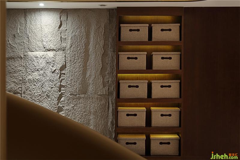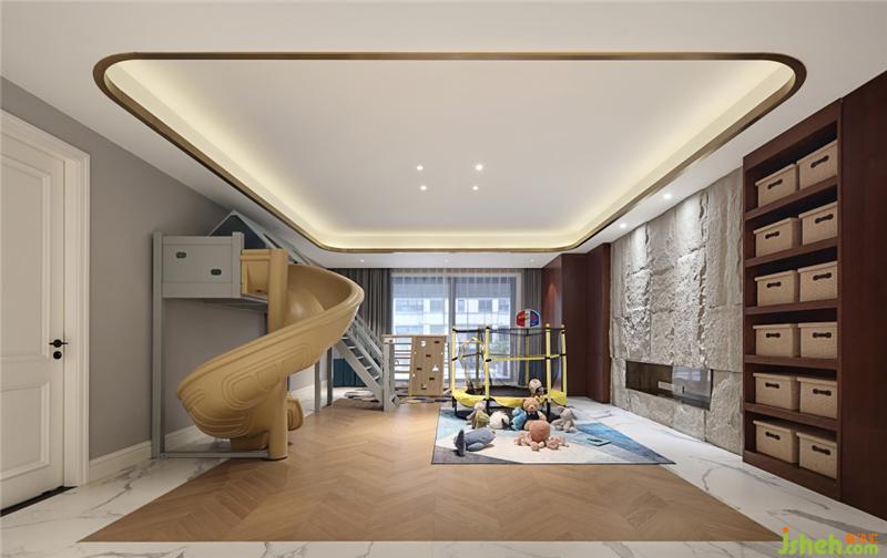 木飾面板暗藏收納柜,搭配基底毛石,大氣自然,藤編收納盒規(guī)則有序,頂面柔和燈光倍增溫馨,孩子玩耍的區(qū)域采用木板,愈增溫度;滑梯、帳篷和蹦蹦床的設(shè)置營造快樂至極的孩童空間;