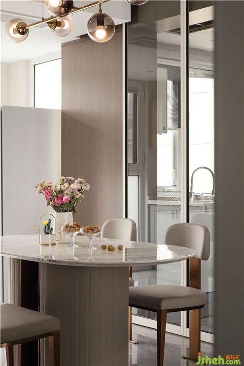 木飾面墻板取代傳統(tǒng)的門套形式上增加空間感,打開廚房與餐廳之間,室內(nèi)設計師敞開式廚房與封閉廚房靈活變化;