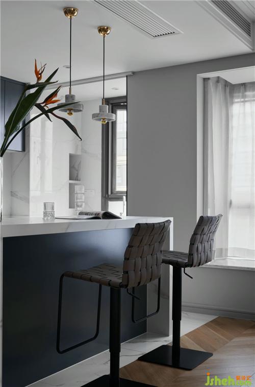 廚房深灰藍(lán)的櫥柜與墻壁上花白大理石鋪陳交匯出冷調(diào)的內(nèi)斂矜持又不失高雅的氛圍,餐桌上的水晶玻璃吊燈,溫潤(rùn)精致,充滿了藝術(shù)美。