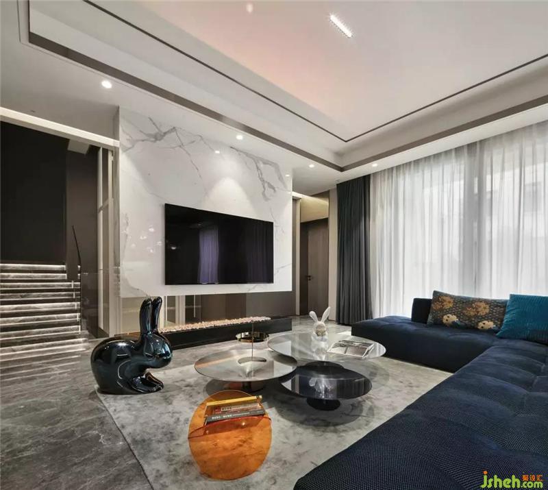 懸浮的電視墻設計,增加了空間的視覺延續(xù)性;真火壁爐的星火光芒、羅奇堡的沙發(fā)和茶幾、稀奇藝術品的擺件,整個空間優(yōu)雅時尚,彰顯著主人對生活的態(tài)度。