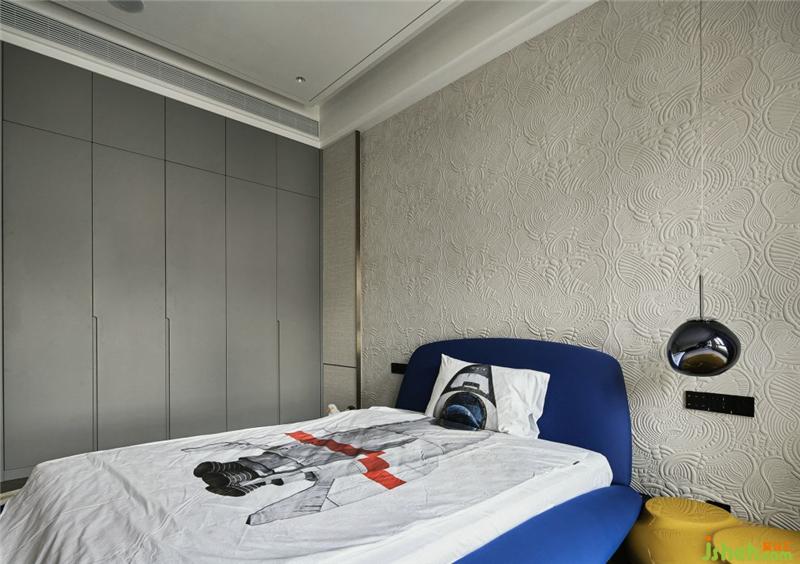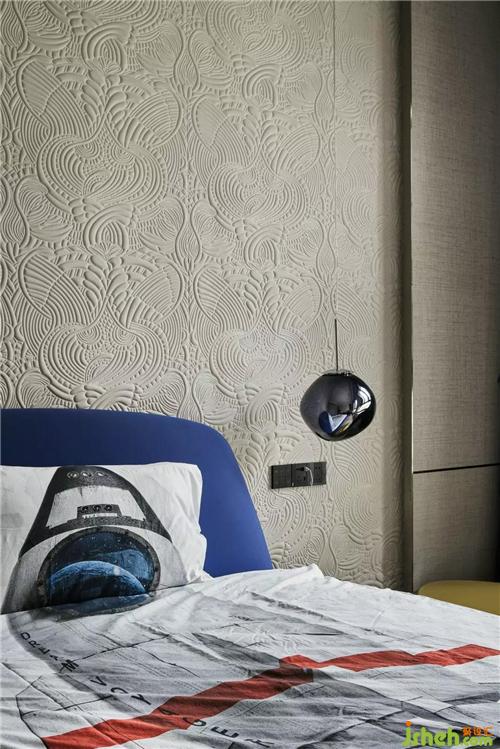 每一個(gè)孩童的內(nèi)心都有一個(gè)飛向太空的夢(mèng)想,背景凹凸肌理的壁布猶如月球表面,Tom Dixon的小吊燈充滿科技感,蔚藍(lán)色的床身和宇航服的床品,都在用父母的愛告訴小朋友:勇敢的去追尋你的夢(mèng)想吧!