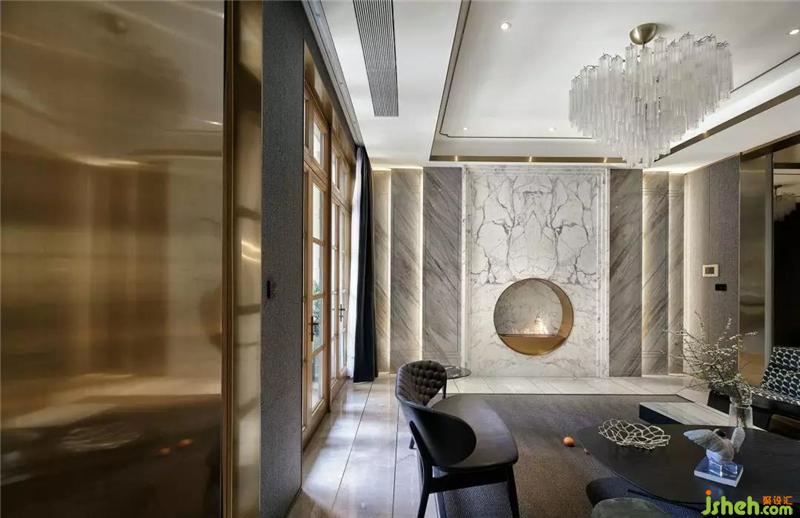 在這個(gè)遠(yuǎn)離塵囂的法式合院里,更是于繁華都市中獨(dú)享一片寧靜,推開家門,撲面而來的繁花背景搭配金屬材質(zhì)的端景臺(tái),豐富的材質(zhì)與色彩變化,增添雅奢趣味,方正開闊的空間,避免繁雜線條與多余家具,當(dāng)居住者身處其中,亦能感受到空間開揚(yáng)洗煉、明亮采光縈繞。