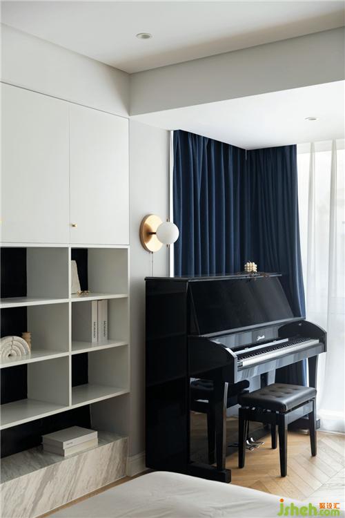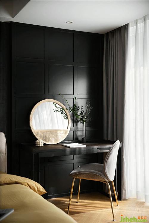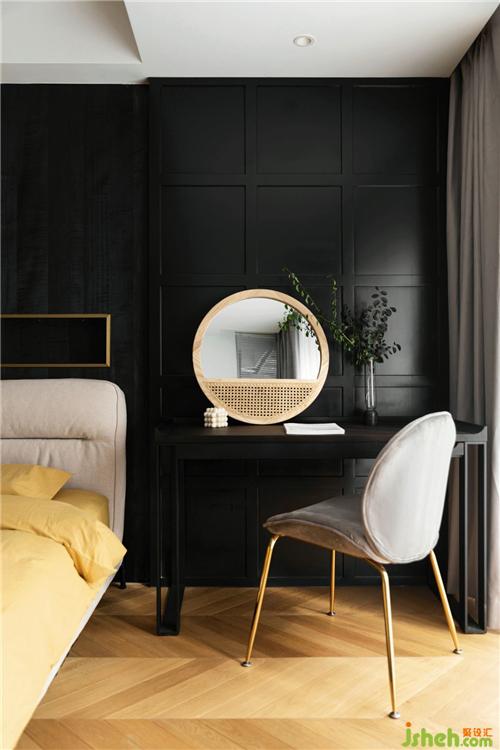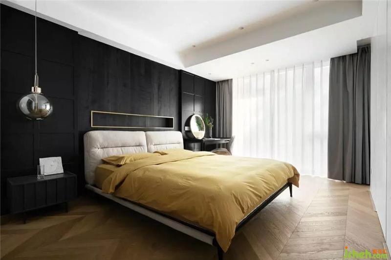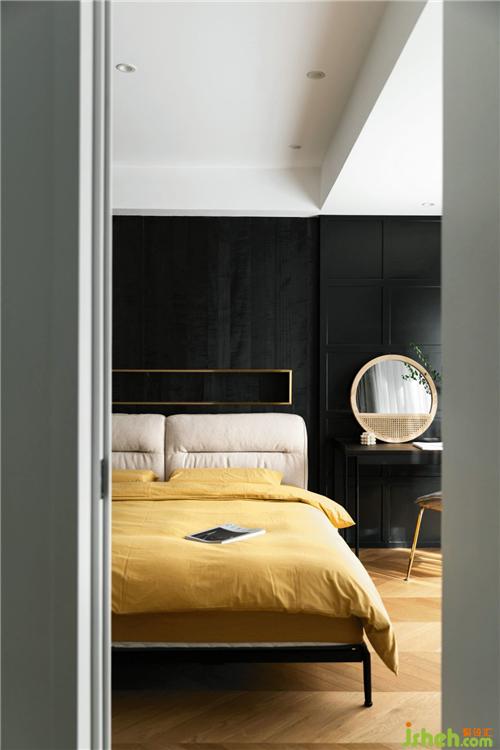 不同質(zhì)感的黑色護(hù)墻搭配暖黃色的床品摩登而時(shí)尚,金屬材質(zhì)的融入更加輕奢質(zhì)感,陽(yáng)光灑過(guò),溫暖愜意寧波裝修設(shè)計(jì)。