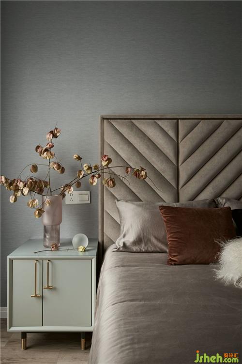 次臥室溫馨細(xì)膩,杭州裝修設(shè)計(jì)充滿動感的床背和流線型的吊燈,配以“枝搖風(fēng)鈴動,花滿自然秋”的復(fù)羽葉欒樹花藝,一派歲月靜好的景象。