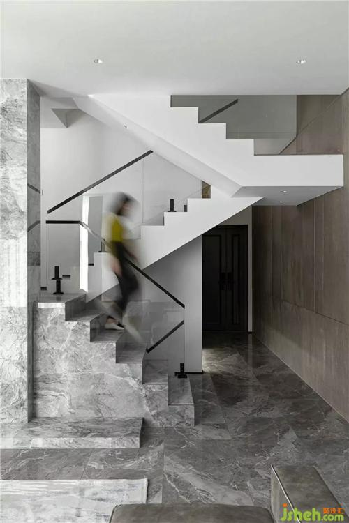 轉(zhuǎn)過客廳,灰色石頭上雕刻一體的踏步,白色的轉(zhuǎn)折樓梯,裝飾空間的同時(shí),又引領(lǐng)著生活的幸福篇章繼續(xù)鋪展開來。