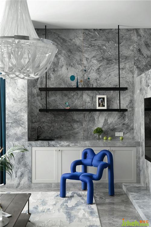 客廳雙朝向的落地窗,使空間在不同的時(shí)間段內(nèi)都光線充足,沐浴陽光之下,一杯茶水、一本書可以坐享一天的悠閑時(shí)光。在灰色大理石和白色墻面的基調(diào)里,窗簾與裝飾畫的湖藍(lán)色點(diǎn)綴其中,既中和了空間的溫度又構(gòu)造了美好生活的音律。