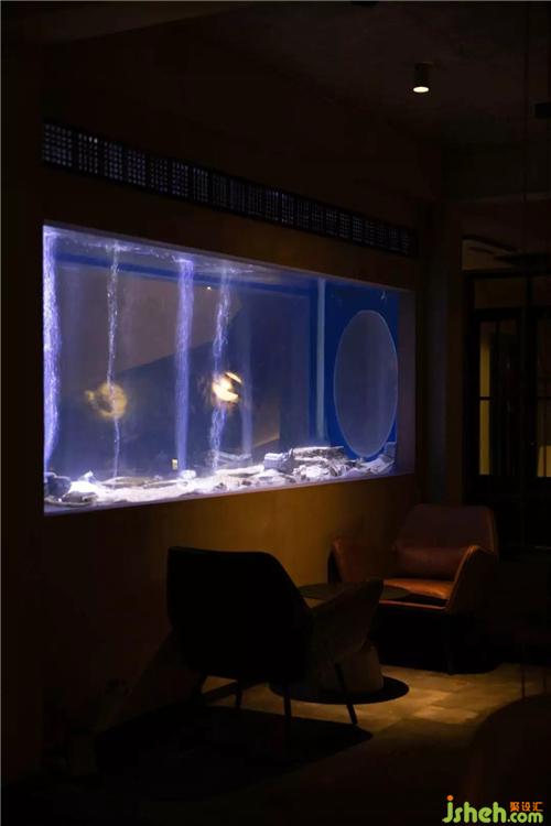 步入室內(nèi),首先映入眼簾的是一個魚缸,它有一個凄美的名字叫 “鯨落”,懂的人自然明白,一只鯨落的消失殆盡才有了現(xiàn)在的萬象平衡,透過魚缸,窗外的景色似乎和海底世界融為了一體。