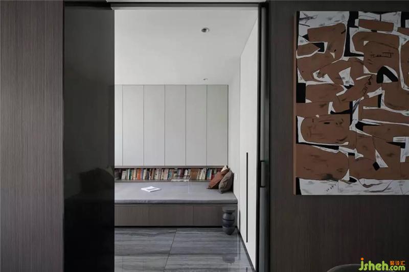多功能的書(shū)房延續(xù)了客餐廳深色的理石地面和原木灰木飾面,紹興裝修設(shè)計(jì)和書(shū)桌連接處獨(dú)立出一個(gè)黑色開(kāi)放柜構(gòu)建了空間幾何感,酒紅色的單椅和中灰的布藝坐塌,使得整個(gè)空間顯得非常有層次和舒適。