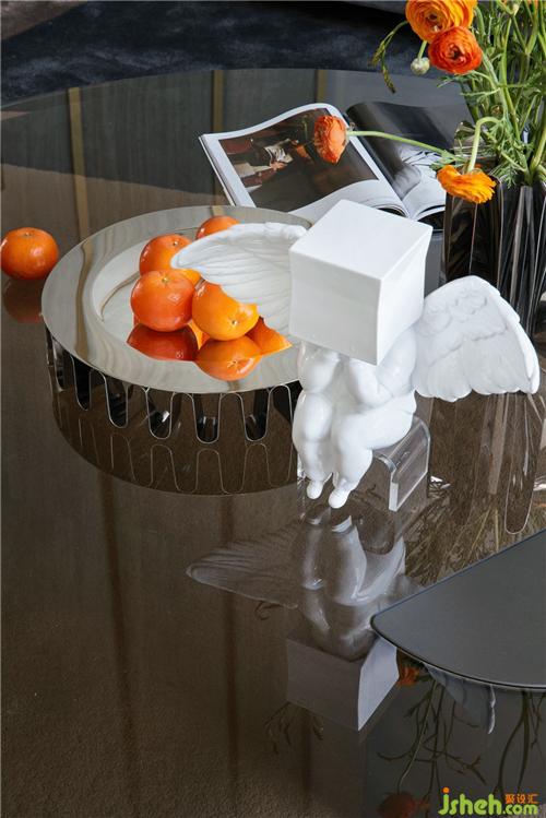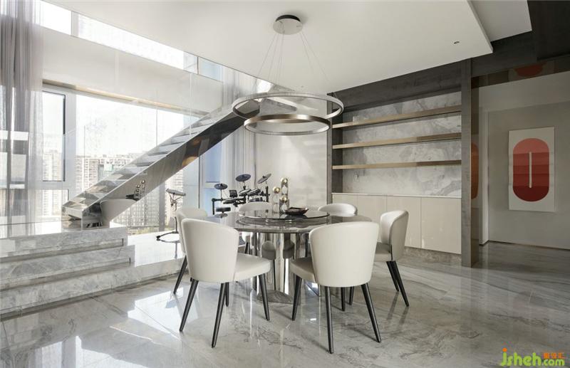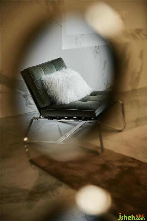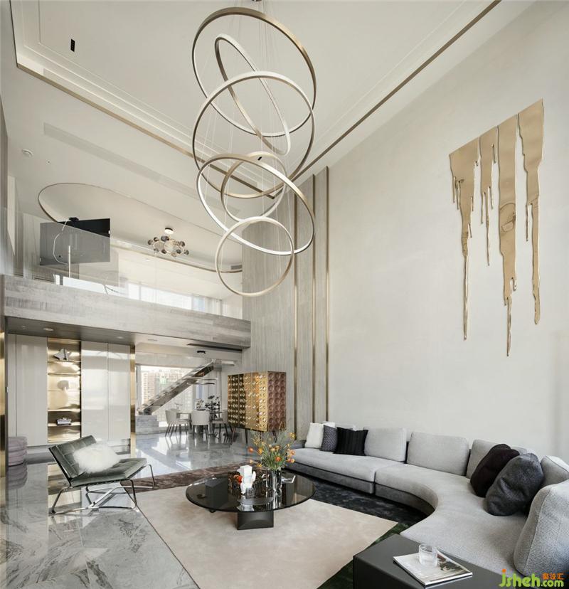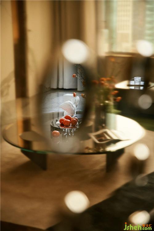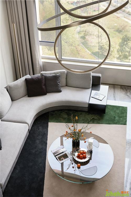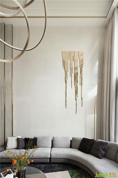 客廳背景的金色藝術(shù)裝飾宛如大自然水滴聚集落下那一瞬間形成的美妙天然狀態(tài),與這套位于錢塘江畔數(shù)百米外的一線江邊景色相互呼應(yīng).