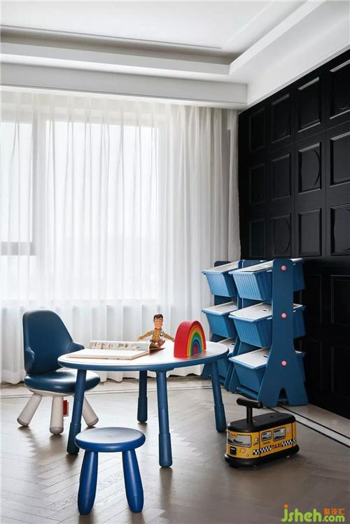兒童房外側(cè)使用了專門定制的黑色護墻,一方面增加了空間的層次和質(zhì)感,另一方面是要與入戶玄關(guān)鞋柜后墻,兩面整合在一起上海室內(nèi)設(shè)計師。