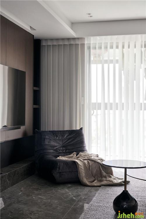 電視背景墻使用了一整塊木飾面加上有規(guī)律的分縫,與進入主臥的隱形門形成一個整體,同時也留有適當儲物的空間;使用了深色的木飾面,沙發(fā)背景墻設計師就采用了淺色搭配上少許的石膏線條,簡單又不單調。