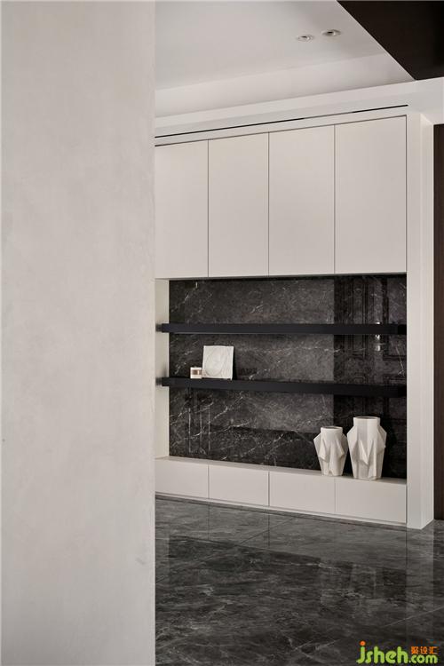 設計師把原始戶型一進門的一整面墻做成了玄關柜,背面是主臥的衣柜,很大程度上利用了僅有的空間,力設計客廳大部分的儲物空間也都做到了玄關位置。