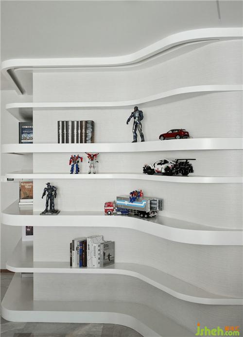 二樓家庭廳在天井位置增加了藍(lán)色玻璃,圓形吊頂與天井大小相同,加上不規(guī)則吊燈,光束映照到一樓玄關(guān)位置,仿佛是一件藝術(shù)裝置;藝術(shù)是對(duì)一件事、一個(gè)物品乃至一個(gè)念想賦予外界的認(rèn)知和自我認(rèn)知融合在一起產(chǎn)生的精神祈求。