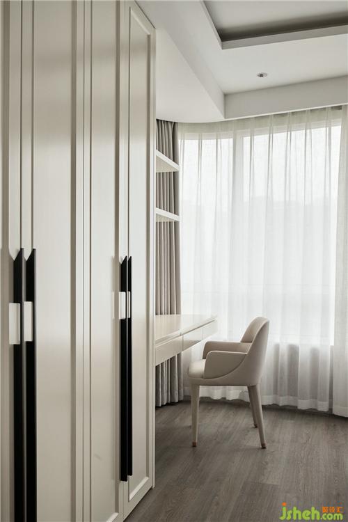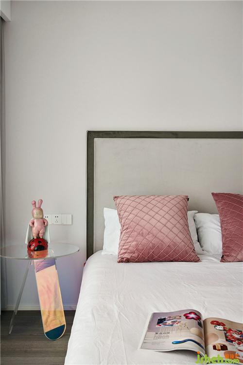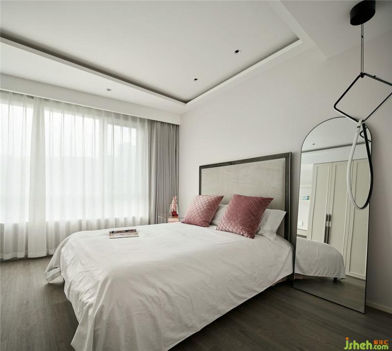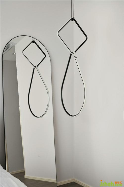 女孩房使用比較極簡的風(fēng)格,床對面打造了書桌和衣柜;必不可少的全身鏡,搭配上不規(guī)則形狀的吊燈,整個女孩房簡單大氣。