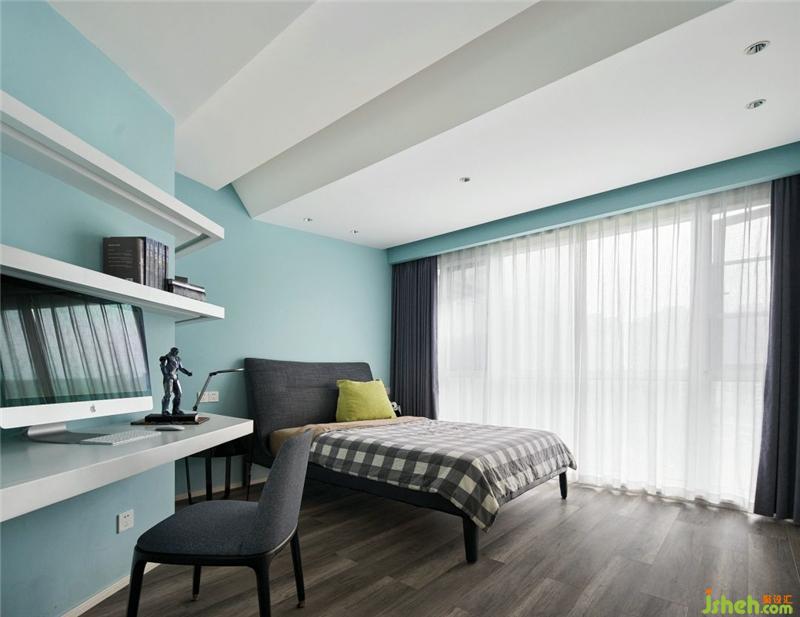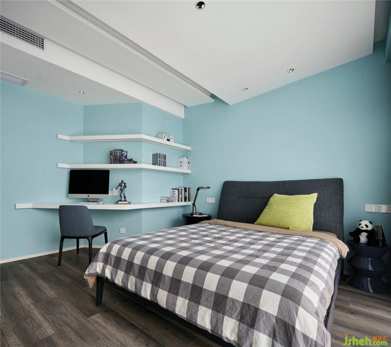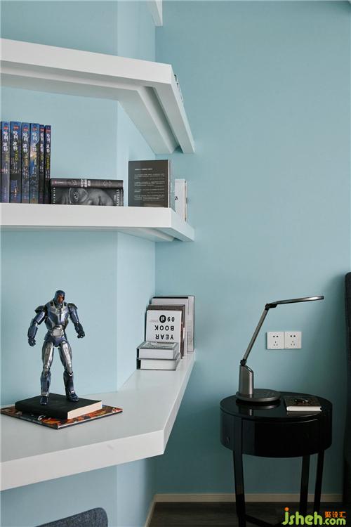 男孩房不規(guī)則墻面與家庭廳連接,所以兩者都采用制作隔板來增加儲物功能,同時也作為展示架;男孩房選用淡藍(lán)色的乳膠漆刷滿整個墻面,墻面與地面不規(guī)則形狀讓整個男孩房充滿神秘的感覺。