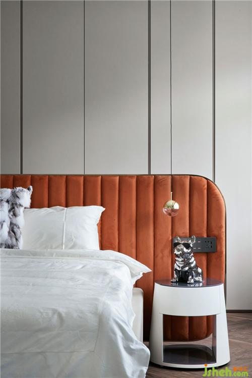 女兒房主色調為橘色,墻面上使用凹凸感很強的墻紙,搭配上cattelan italia的不規(guī)則鏡子;床背景設計現(xiàn)場制作的弧形與軟包搭配,考慮到原始戶型結構為長方形,則把化妝臺設置到床背景后,呈現(xiàn)出整個女兒房簡單而奢華的情調。