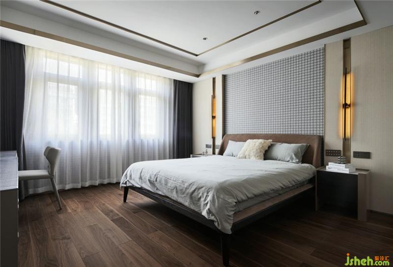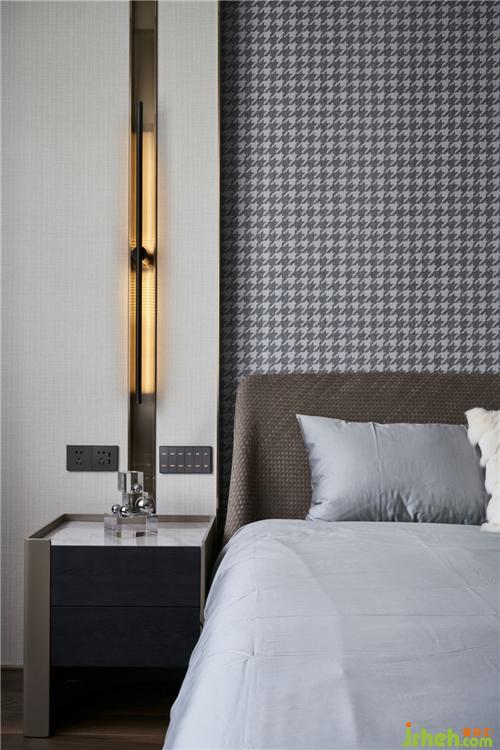 次臥硬裝與軟裝之間的配合十分緊密,墻面打造凹凸質感,兩種材質貼于墻上,同時床體尺寸配合墻面尺寸,兩側加入金屬線條掛壁燈,營造整體溫馨氛圍;