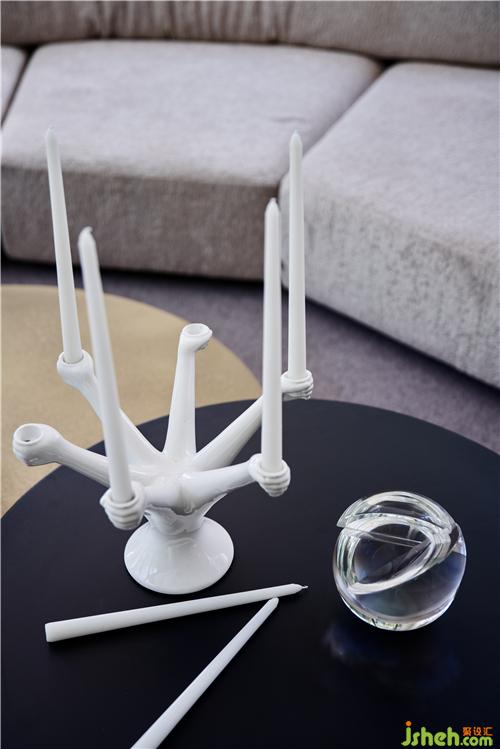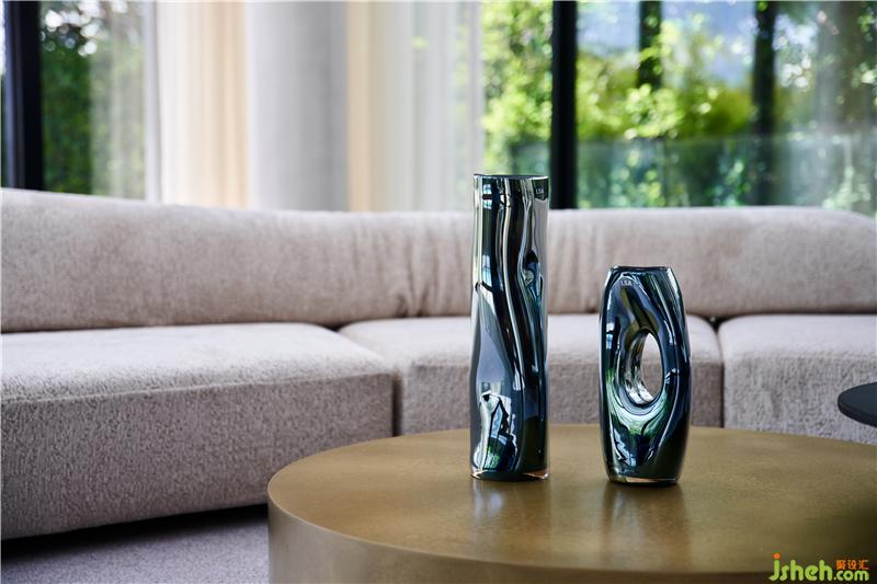 軟裝搭配需要別出一致,不超過自然美景但同時也要與之配合。藍色單人沙發(fā)與窗外的藍天池水對應,作為空間跳色不單調(diào)且高級,茶幾金屬質(zhì)感,沙發(fā)布藝質(zhì)感、擺件玻璃質(zhì)感等共同組合,為這一個空間的增添亮點。