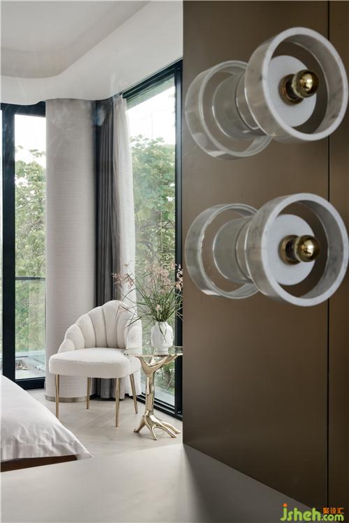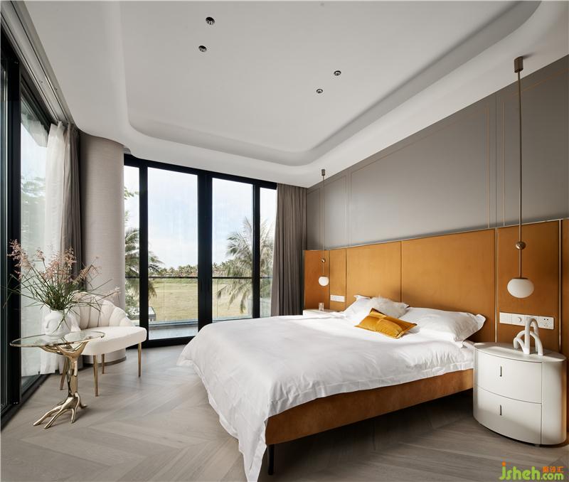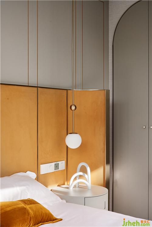 次臥主要打造一個相對活力的臥室,所以使用鮮艷的橙色作為主色調(diào),現(xiàn)場制作的硬包與床架選用同一布藝材質(zhì),金屬作為點綴;單人沙發(fā)散發(fā)著優(yōu)雅華貴的氣息,邊幾非常有特色,是兩只手掌組合的形狀。