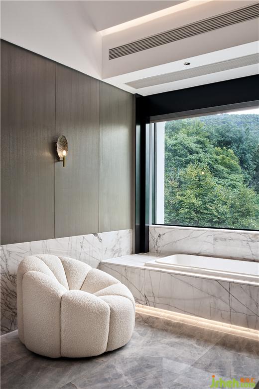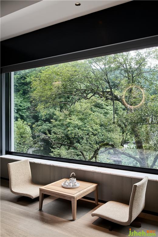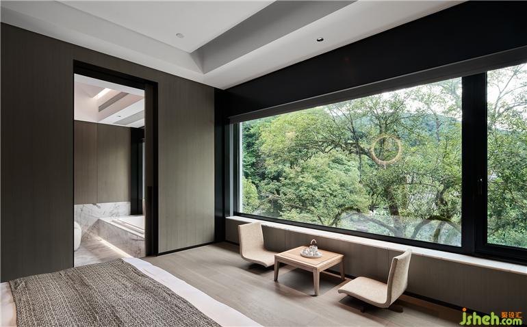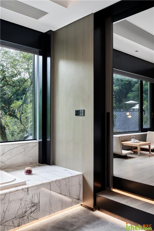 杭州度假酒店設(shè)計(jì)白色系的墻頂面搭配黑色系的墻面和家具為房間增添一份干練且舒適的氣息。窗外綠意盎然的植被給客房增添了些許質(zhì)感與愜意。