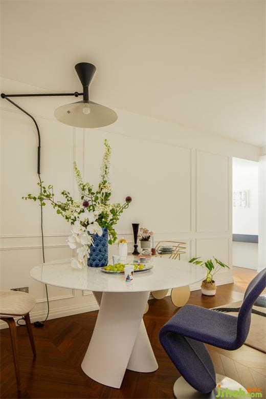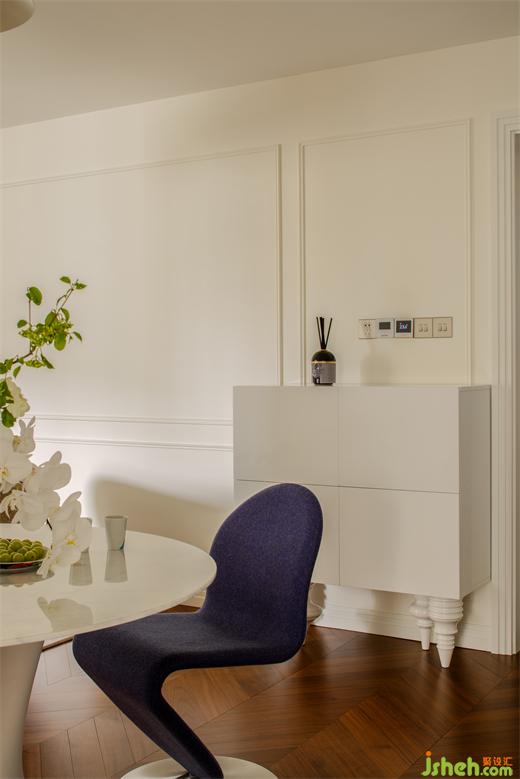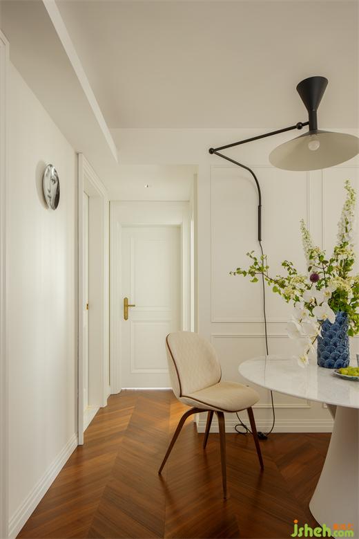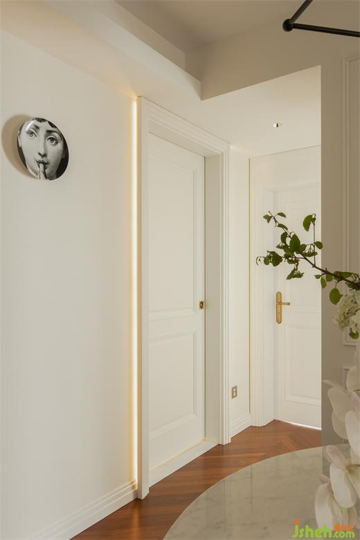因為原始結(jié)構(gòu)的局限,硬裝上沒有做過多裝飾,墻面簡單的定制線條營造著輕松的法式氣息。定制門與門套在傳統(tǒng)法式線條疊加的基礎(chǔ)上,上海公寓改造設(shè)計摒棄了過多的弧形元素,采用直線條疊加,既符合空間柔美中又帶有硬朗的氣質(zhì),同時也表達(dá)了居住者的性格與處世態(tài)度。