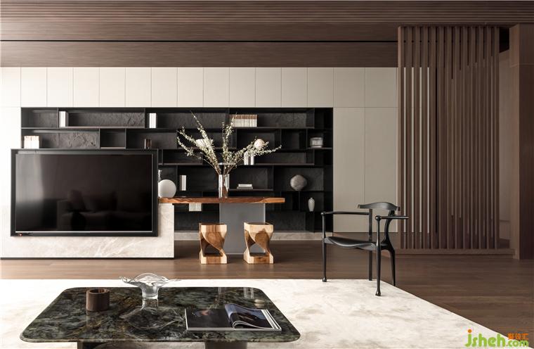 本案的特殊之處在于原始結(jié)構(gòu)中接近四米的層高:中贏星際豪宅設(shè)計(jì)非同一般平層住宅空間優(yōu)越條件,卻少了一些人在實(shí)際生活中的尺度。設(shè)計(jì)師重置了尺度系統(tǒng),將寬裕的高度轉(zhuǎn)化為組合光源的深度;墻面兩側(cè)通高的大理石與柜體均在展示著利落而硬朗的空間氣質(zhì)。