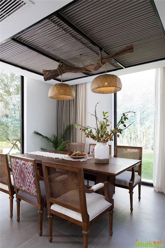 餐廳采用返璞歸真的風(fēng)格,采用仿真枯木元素與編織元素營造田園山野的輕松氛圍。但實木家具與精致的圖案又將奢美巧妙的結(jié)合起來。