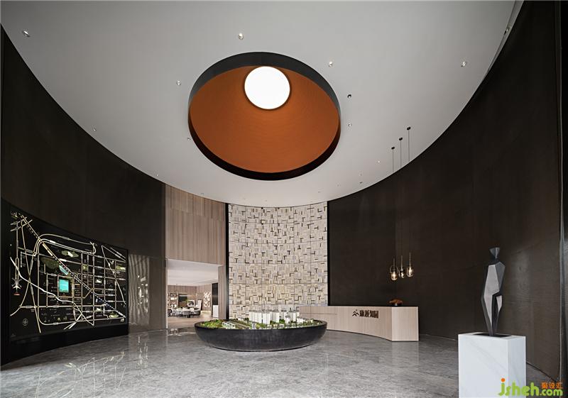 從遠處看,沙盤區(qū)頂部是一個巨大的圓形,淺灰色的天花與深灰墻壁相互照應(yīng),像是一個巨大的鉛球,給人予沉重質(zhì)感。設(shè)計師在視覺的終點設(shè)置了一面紙質(zhì)屏風(fēng),由層層切開的紙張做成箱體,紙層次會根據(jù)色彩及自然的生態(tài)做排列,在細節(jié)上看,高高低低的切割工藝,體現(xiàn)出最自然的藝術(shù)感。裝修公司