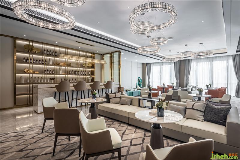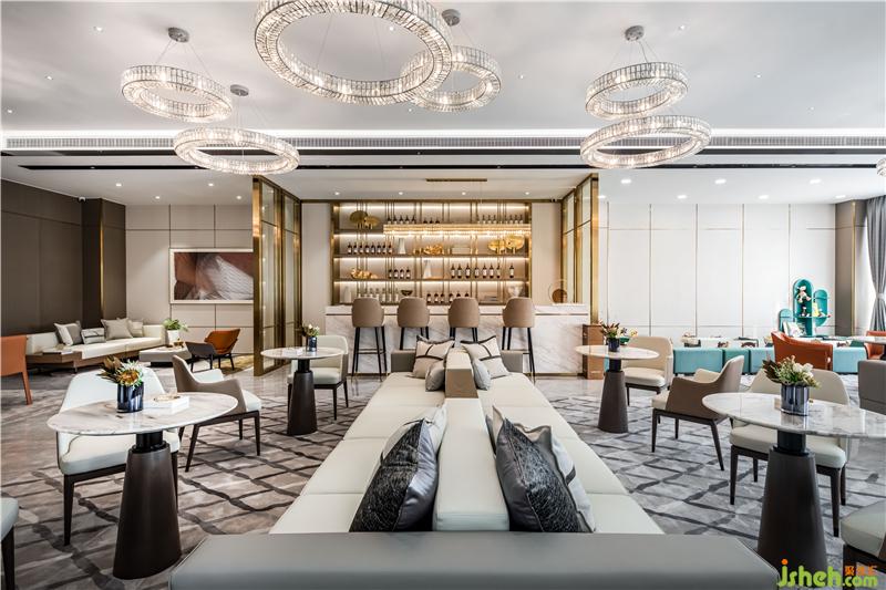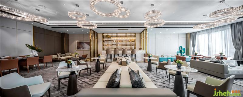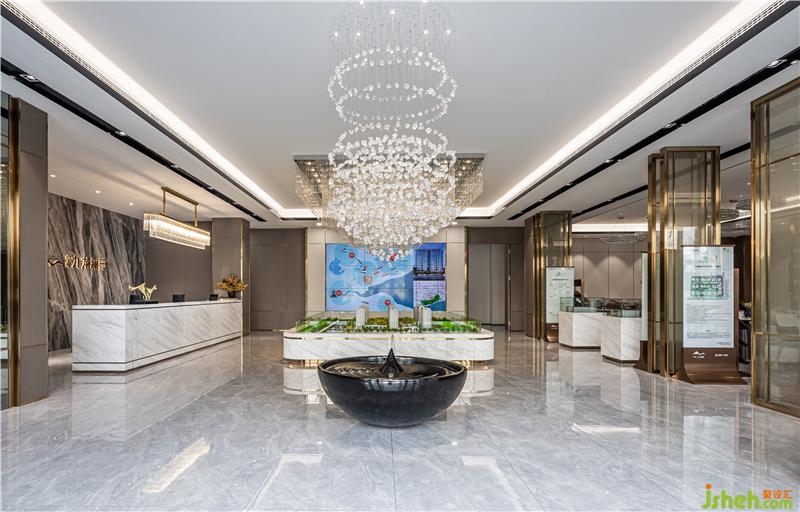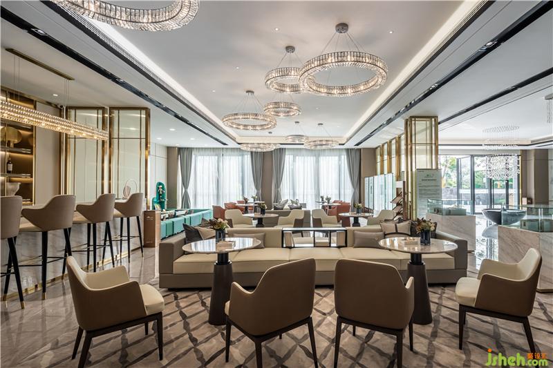 進入前廳,首先映入眼簾的便是乍浦的“水”,水滴形狀的不規(guī)則吊燈,跳躍的水珠緩解了縱向線條的單一和緊張,為空間增添了靈動感,與流水裝置的雕塑相互呼應(yīng)——水滴落在水面上,蕩起層層漣漪。