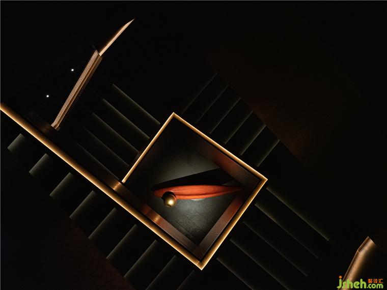 起承轉(zhuǎn)合,樓梯處于餐廳較為中央的位置,緊鄰明廚和散臺,作為聯(lián)結(jié)上下的通道,在暗色環(huán)境中尤為突出,就像一個(gè)中樞視覺點(diǎn),喜瑞餐廳設(shè)計(jì)既豐富了空間層次,在不同層面都可通過樓梯觀賞,又彌補(bǔ)了空間過度的空隙,弱化固有的空間感。轉(zhuǎn)折而開闊,一葉泛舟自成一景,彰顯一派大氣風(fēng)范。