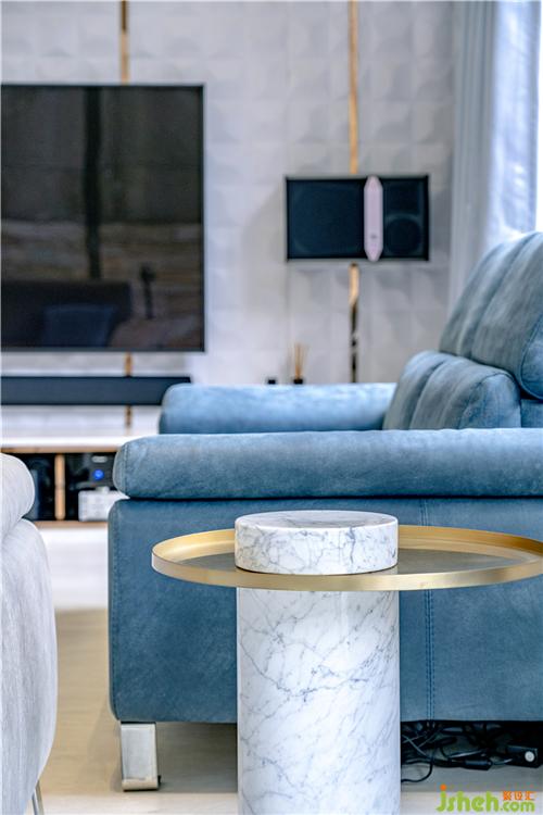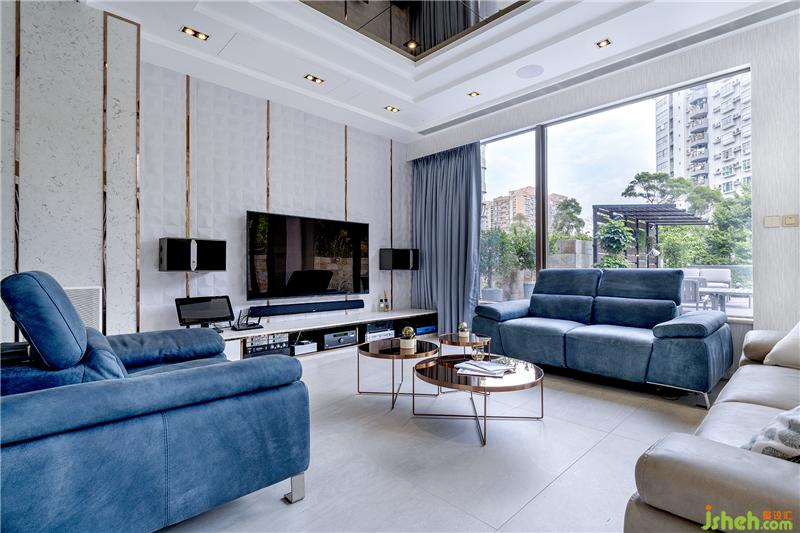 客廳設(shè)計(jì)以白、灰、藍(lán)為主,設(shè)計(jì)師將不同的材質(zhì)交錯(cuò)運(yùn)用,風(fēng)格色調(diào)成熟沉穩(wěn)。擺飾架與墻身融為一體,為旁邊的樓梯多透一點(diǎn)光。通向花園的門采用大塊落地玻璃設(shè)計(jì),除了采亮度和空間感極好之余,亦盡顯水晶吊燈的氣派,莊重優(yōu)雅中突出時(shí)尚細(xì)節(jié)。