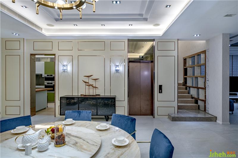 飯廳的云石元素較多,其中以云石特色墻最為矚目,設(shè)計(jì)師以飾柜和餐桌呼應(yīng),與客廳清楚分開兩個(gè)空間,卻又以灰藍(lán)色餐椅與客廳沙發(fā)互相影襯,保持設(shè)計(jì)整體連貫性,細(xì)節(jié)花盡心思帶出含蓄的美?,F(xiàn)代別墅裝飾
