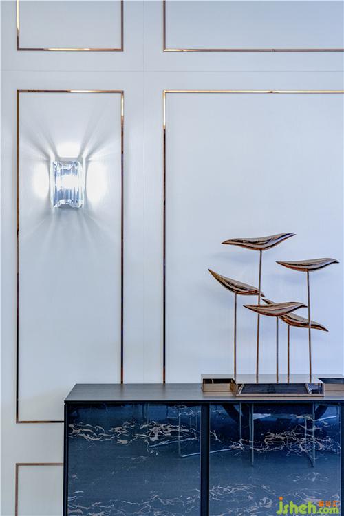 玄關(guān)層主要以出入為主,入墻大柜為戶主帶來足夠的儲(chǔ)鞋空間,藍(lán)色絨布座椅為貫徹主題,帶出優(yōu)雅奢華感覺?,F(xiàn)代別墅裝飾