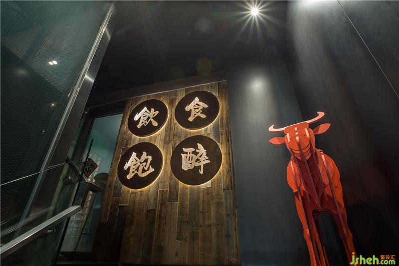 入口處以公牛藝術(shù)裝置和光暈招牌首先展示目的,踱步至主入口由玻璃磚墻和白色瓷磚墻圍合而成的展示墻,兩個金色的品牌標(biāo)識彼此相對,清楚地告知客戶店鋪由兩個不同的品牌集合而成。餐廳設(shè)計