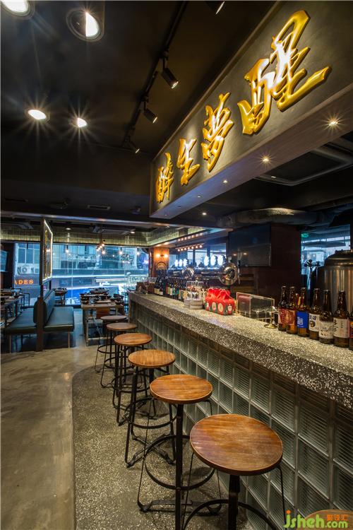 運用高低階梯差設(shè)計將酒吧區(qū)從整體中稍微區(qū)隔開,亮眼的“醉生夢醒”招牌讓這里更添享受當(dāng)下的氛圍。等待時坐在水磨石吧臺前,享用釀酒師新鮮釀造的季節(jié)性手工啤酒,讓舒緩的信號傳遞整個身體。