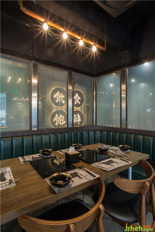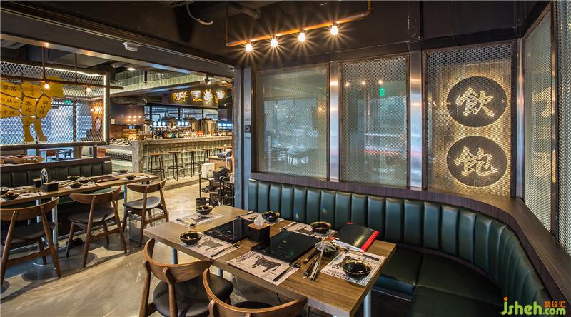 開放式設(shè)計打造主用餐區(qū),利用卡座固定部分座位,再搭配可移動座位,整體達到高效靈活??臻g中吊燈和家具的選擇均采用質(zhì)樸的金屬、鋅水管、木材和皮革定制,近天花處圍合一圈玻璃磚,在燈光的照射下發(fā)出迷離的光環(huán),融合實際的工業(yè)氛圍更貼合顧客需求,讓用餐成為享受。餐廳設(shè)計