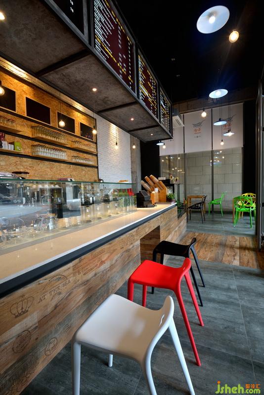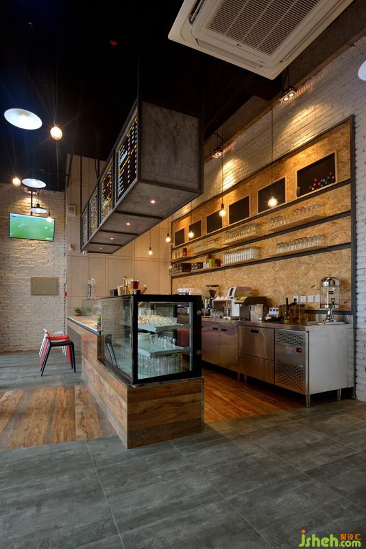 本案例的材料基本上以奧松板、紅磚做舊、鋼材、水泥板、硅酸鈣板、玻璃、乳膠漆和仿木地磚、水泥地磚等等來運(yùn)用來打造。首先,室內(nèi)設(shè)計(jì)師在門頭運(yùn)用了水泥板作為基調(diào)配上白色的LED照明的Loog,每當(dāng)夜晚降臨時(shí)刻門頭便發(fā)出耀眼的光芒,時(shí)刻提醒著人們它的品牌功能。服務(wù)臺(tái)位于地中央以鋼結(jié)構(gòu)為基礎(chǔ)表面是仿木地磚飾面,臺(tái)面運(yùn)用白色石英石和玻璃相結(jié)合,給人以衛(wèi)生、安全之感。服務(wù)臺(tái)上面的燈箱是鋼結(jié)構(gòu)骨架加上水泥板材質(zhì)給人一種強(qiáng)烈的工業(yè)風(fēng),燈箱運(yùn)用LED燈管照明,節(jié)能環(huán)保是設(shè)計(jì)的主題,最大限度減少業(yè)主的運(yùn)營成本。服務(wù)臺(tái)后面的背景是以奧松板為主體配上鋼結(jié)構(gòu),使之與磚墻、服務(wù)臺(tái)相對(duì)應(yīng)進(jìn)行強(qiáng)烈的對(duì)比。白色的磚墻木色的背景、鋼筋混凝土的原始結(jié)構(gòu)、水泥地磚之間的色彩上、材質(zhì)上之間互相穿插,形成了強(qiáng)烈的對(duì)比構(gòu)成了現(xiàn)代氣息非常濃烈的工業(yè)風(fēng)格的歸本主義。這一做法重新定義了原始建筑結(jié)構(gòu)和工業(yè)文化的含義,使工業(yè)建筑物不再是丑陋的廢墟,而是如夢(mèng)如幻的風(fēng)景來供人們欣賞。使得顧客來此地消費(fèi)仿佛置身于一個(gè)美麗的新世界,爭強(qiáng)了顧客與室內(nèi)空間的互動(dòng)感。