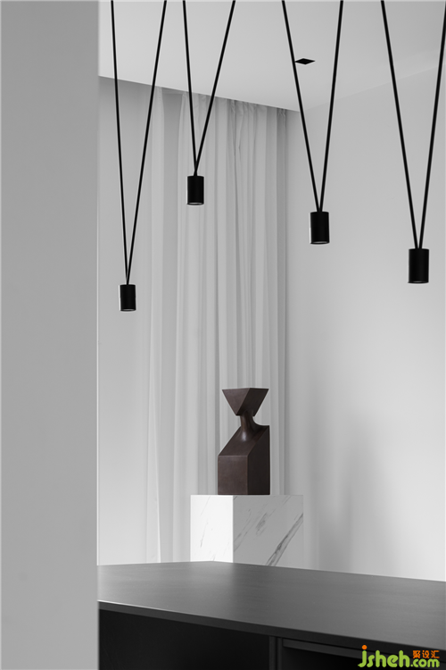 “客廳墻壁的設(shè)計(jì)摒棄了電視機(jī)之后,切實(shí)的感受真火壁爐的溫度,閑看三兩書,猶如那雕塑——“我看到了幸福”。于光線交織物件與空間的敘述性。