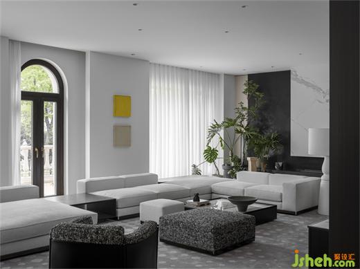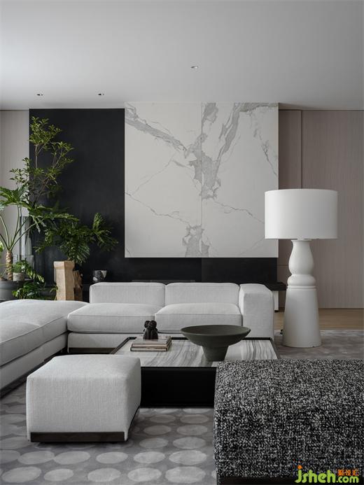 客廳以黑白灰為主色調(diào),選擇棉麻質(zhì)感的沙發(fā),別墅裝飾搭配磨砂感的炭黑色墻面以及光亮的大理石元素,獨(dú)特的質(zhì)感與光澤使整個(gè)空間看起來(lái)舒適且舒服。別墅裝飾墻上點(diǎn)綴著橙,黃,棕,米色的暖色調(diào)不規(guī)則肌理的小色塊,與平整的白色墻面相互碰撞,平靜中增添許多趣味。