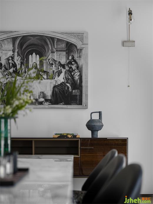 餐廳的邊柜是光面的木制材質(zhì),其上擺放著先秦樣式的的煮茶器具,仿佛是陳列在博物館的藏品,有著陳舊和故事感。別墅裝飾墻上的拉繩開關(guān)電燈泡形狀的壁燈喚起了人們兒時(shí)的回憶,一瞬間時(shí)空恍惚,仿佛回到了幼時(shí)無(wú)憂無(wú)慮,自由自在的溫暖時(shí)光。屋主信奉天主教,墻上掛著《最后的晚餐》畫作,中西交融,意境悠遠(yuǎn)。