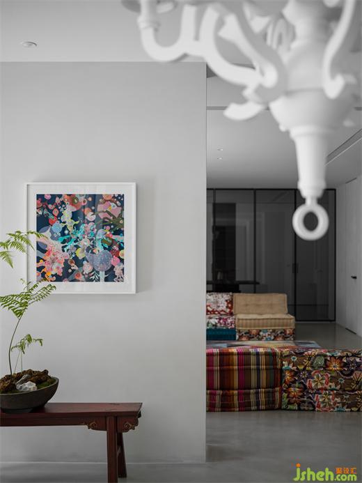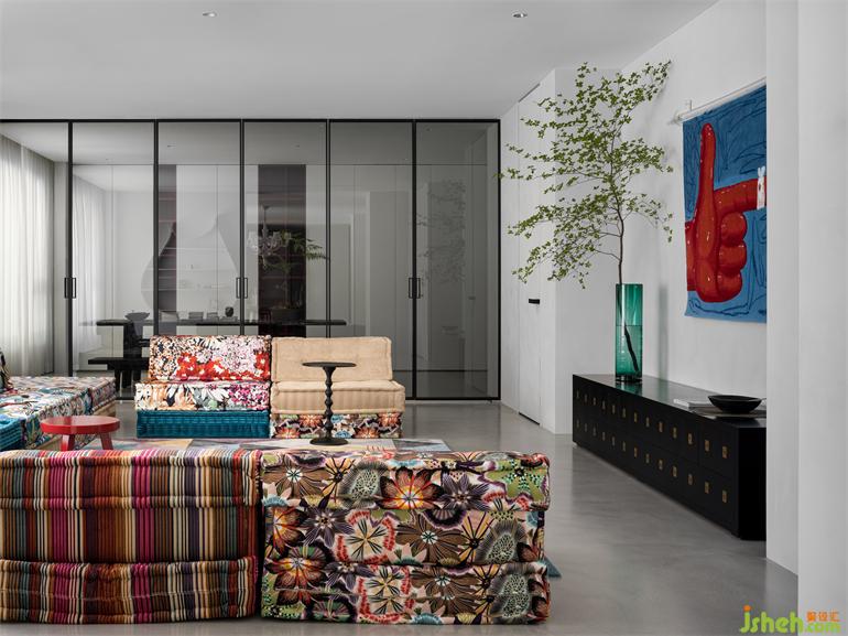 高飽和度的幾何圖形掛畫,墨綠色的沙發(fā),紅色的可愛兔子座椅,莫蘭蒂色地毯,別墅裝飾使靜態(tài)的極簡(jiǎn)之家充滿靈動(dòng)的藝術(shù)時(shí)尚感。