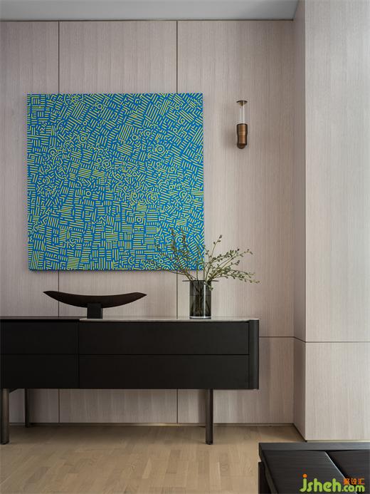 磨砂質(zhì)感的黑色柜子,搭配以抽象藍(lán)色掛畫與古銅色復(fù)古壁燈,別墅裝飾在簡(jiǎn)約的基礎(chǔ)上增添的精致與華麗。