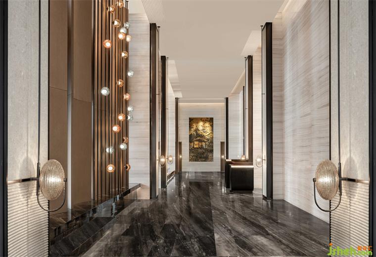 通道弧形墻體及幻化自泉涌形態(tài)的藝術壁燈,于咫尺內復現(xiàn)“山水入城、酒店設計千泉競涌”的泉城美景,松弛感的場域精神瞬間拉滿。城市喧囂就此遠離,詩意之旅從此開啟。