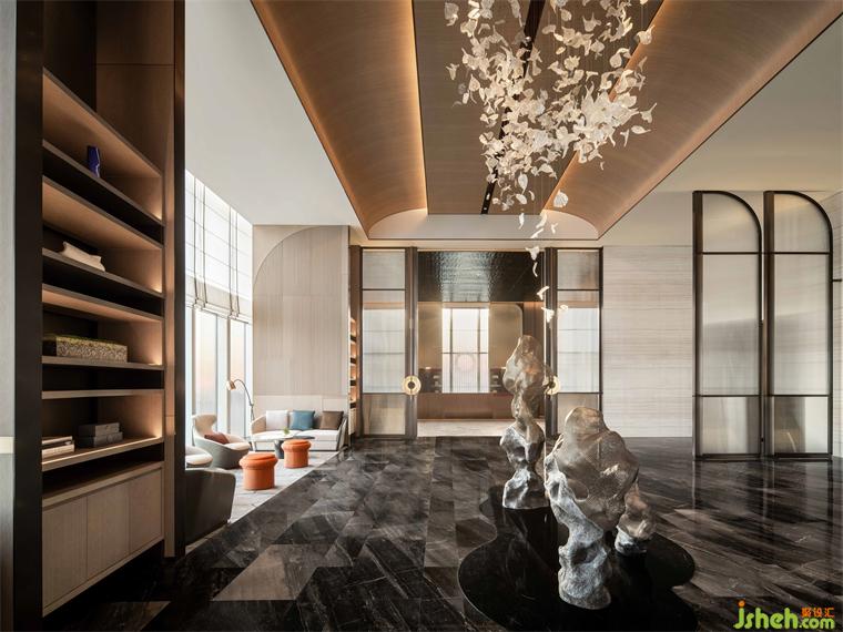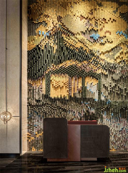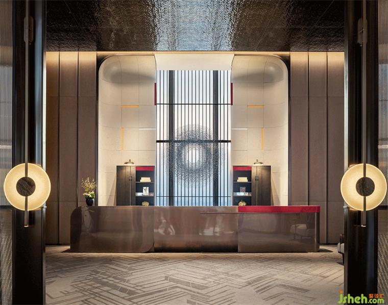 抵達大堂將青磚黛瓦、園林亭臺的濟南傳統(tǒng)四合庭院解構,酒店設計藉由窯變產(chǎn)生細微差別的多重色澤陶片表達,不同光線不同角度產(chǎn)生奇妙差異化觀感,形成空間第一處記憶點,構建出極致的、具象的沉浸式歸家體驗。