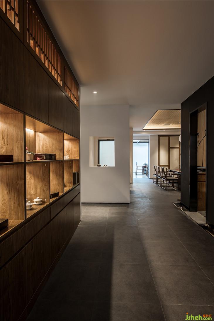 入口走道以白墻灰磚取拙樸之姿態(tài),斑駁感人的光線落下,讓其中的人獲得“靜謐中探尋”的行走體驗?!盎貧w茶本味”理念的融入,也提醒著人們,準(zhǔn)備好迎接那一道茶香。正如作家林清玄所說,人生需要準(zhǔn)備的,不是昂貴的茶,而是喝茶的心情。