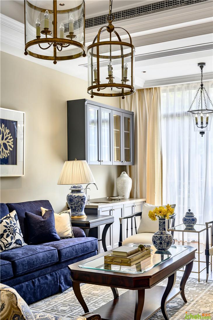 色彩上,寧靜且富有質(zhì)感的灰藍(lán)占據(jù)C位,搭配美式家具、復(fù)古造型的吊燈,將空間內(nèi)斂而深刻的美式奢華與優(yōu)雅情調(diào)延展開來。